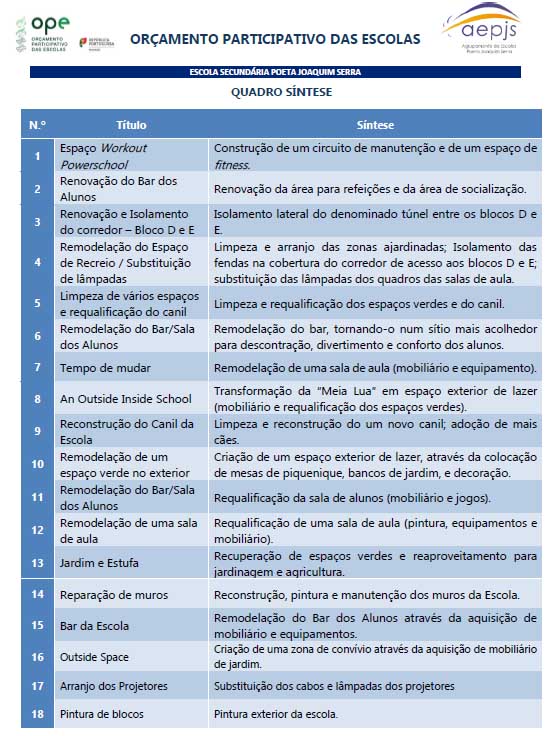 | Encontram-se disponíveis para consulta, na Biblioteca Escolar da Escola Secundária Poeta Joaquim Serra, as 18 propostas apresentadas pelos alunos, no âmbito do orçamento participativo das escolas. A votação decorrerá no dia 20 de março, das 10:00 às 12:30 e das 14:00 às 16:30. A mesa da assembleia eleitoral encontrar-se-á na Biblioteca Escolar. |
