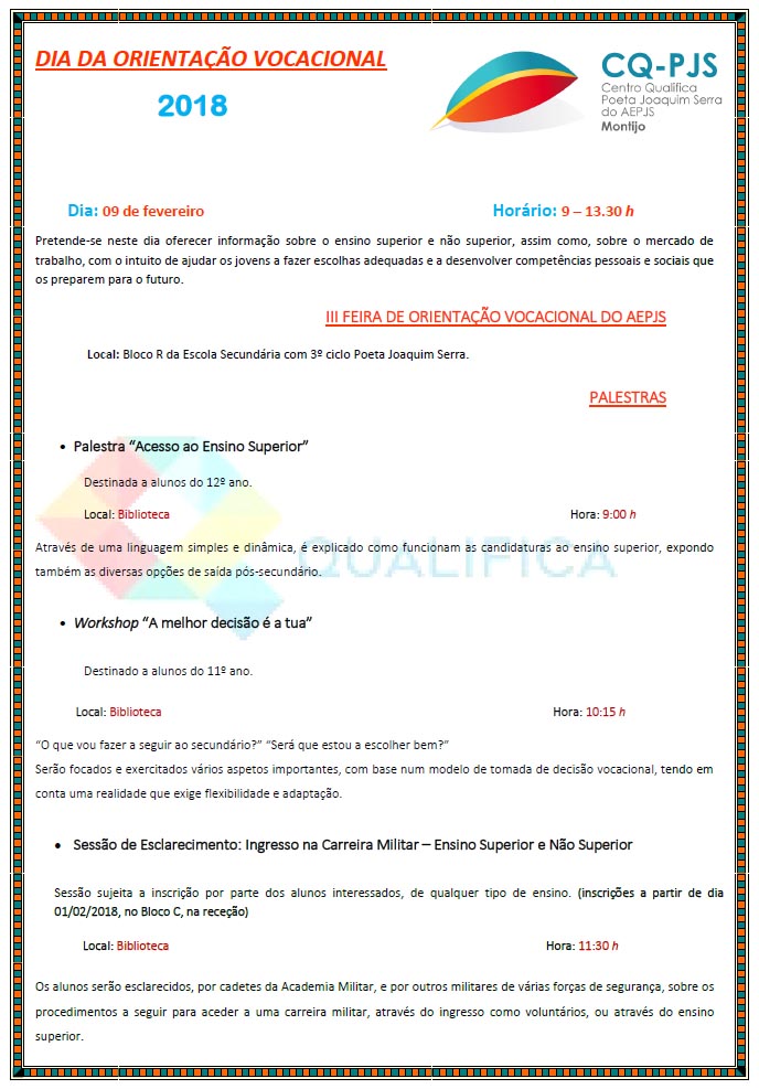 Na próxima 6.ª feira, dia 9 de fevereiro, realiza-se na escola sede do Agrupamento o Dia da Orientação Vocacional, durante o qual vai decorrer a "III Feira de Orientação Vocacional", que contará com a presença de várias Instituições, Universidades e outras entidades, realizando-se ainda a "Palestra Acesso ao Ensino Superior", o "Workshop A melhor decisão é a tua" e a "Sessão de esclarecimento: Ingresso na Carreira Militar – Ensino Superior e Não Superior".